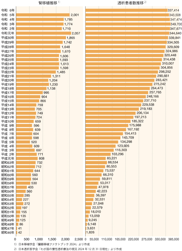 健康な親族から片方の腎臓を提供していただいて行う移植です。近年、移植医療の技術や薬の進歩によって、親子間とともに夫婦間での移植も増えています。